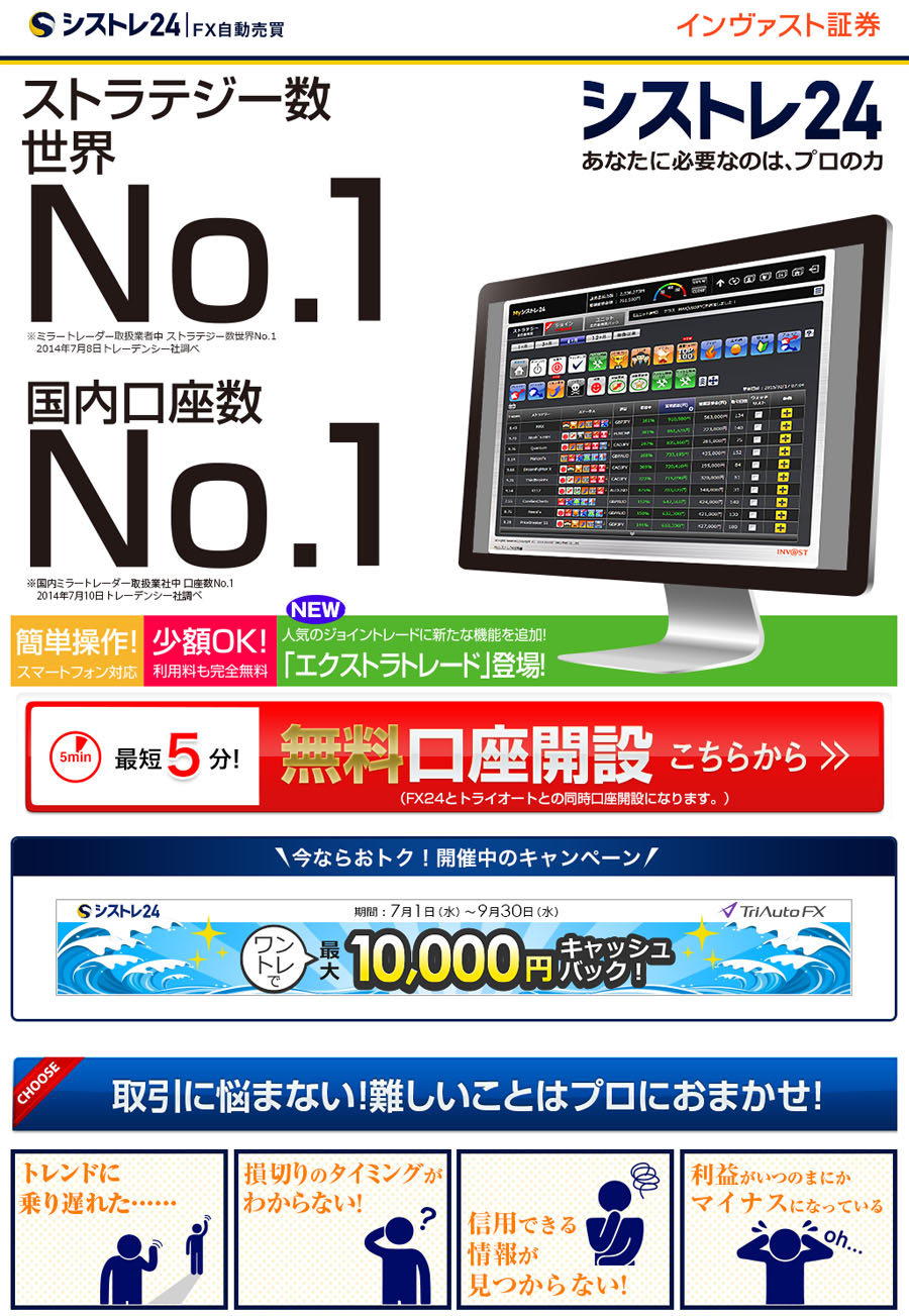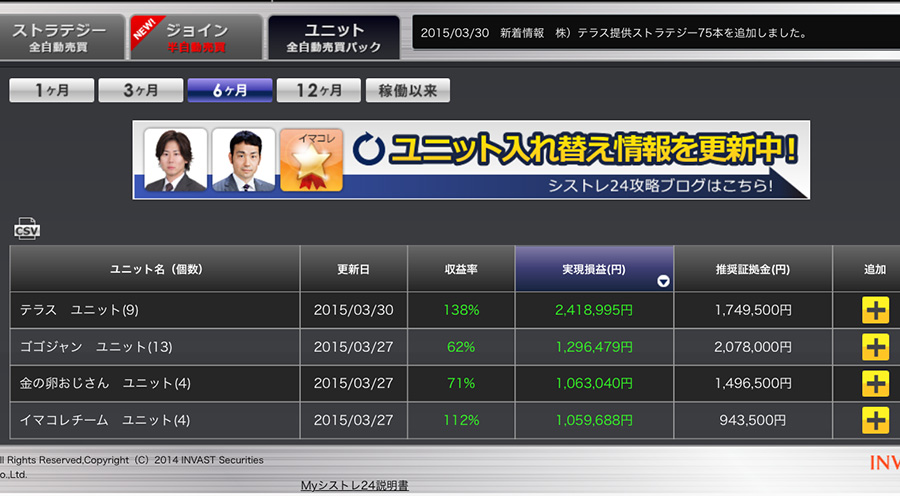 あ: はい。実は、このシステムでサービスを提供しているFX会社さんはほかにあるみたいなんですが、インヴァスト証券さんの運用が優れているということでも、シストレ24は評判がいいみたいですね。