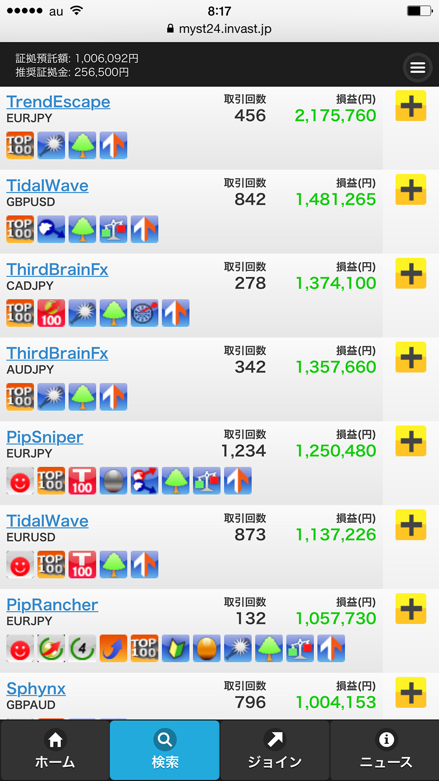 【図】 シストレ24の自動売買プログラム検索画面。緑色の数字がそれぞれのプログラムの実績。「+」ボタンを押すと自分でも利用できる