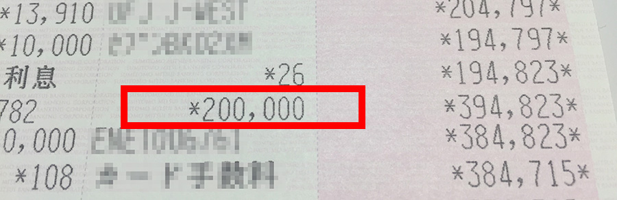 【写真】 家計用の通帳を特別に見せていただきました。インヴァスト証券のアカウントから引き出して振り込んでいる20万円が運用利益の一部。